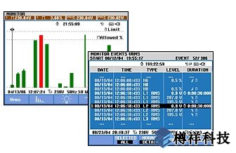 系統監測器總覽屏幕可以即時查看電壓、諧波、閃變、頻率及電壓驟降和驟升的數量是否超出設置限值。 并有一個詳細列表列出了超出設置限值的所有事件。