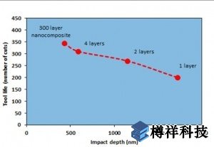 納米沖擊試驗被認為是在優化分層系統的有力工具。用于銑削淬硬鋼(切口的數目)的工具的壽命進行了比較,***大沖擊深度。圖2顯示了一個廣泛的系統的耐沖擊性和切割性能之間的出色的相關性。