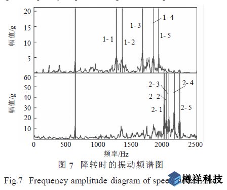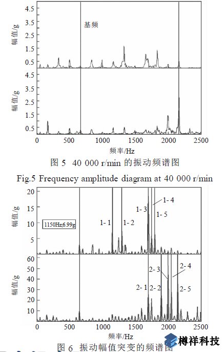 圖6 為從30 000 r/min 推到40 000 r/min 的上升過(guò)程中達(dá)到39 000 r/min 時(shí)振動(dòng)幅值頻譜發(fā)生突變的頻譜圖。從圖中可以看出, 在1 100 Hz~2 100Hz 之間出現(xiàn)了峰值群, ******振動(dòng)幅值達(dá)57.44g, 基頻振動(dòng)幅值也超過(guò)了10g。這表明此時(shí)渦輪增壓器的機(jī)械運(yùn)行狀態(tài)發(fā)生突變, 已經(jīng)出現(xiàn)了故障。圖7 為報(bào)警后試驗(yàn)件迅速降轉(zhuǎn)時(shí)的振動(dòng)頻譜圖, 圖中中***頻的大幅振動(dòng)峰群仍然存在, 基頻嚴(yán)重超限, 已經(jīng)達(dá)到了14.45g, 渦輪增壓器已經(jīng)不能正常運(yùn)行。