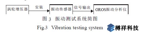 在該渦輪增壓器試驗(yàn)中, 為了測(cè)量其振動(dòng)大小,在壓氣機(jī)垂直和壓氣機(jī)水平兩個(gè)位置分別安裝了ENDEVOC 加速度振動(dòng)傳感器, 試驗(yàn)中規(guī)定的振動(dòng)報(bào)警值為5g。該試驗(yàn)振動(dòng)測(cè)試系統(tǒng)簡(jiǎn)圖如圖3 所示。