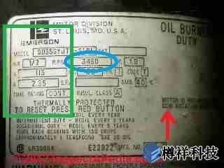 藍色橢圓形標(biāo)記電機的轉(zhuǎn)速 - 3450 RPM - 這是一個***速油燃燒器。 舊油燃燒器和設(shè)備電機以1725RPM運行。 一些HVAC設(shè)備使用變速電動機。