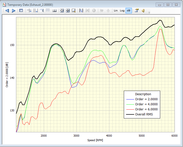 現在我們可以清楚地看到速度相關噪聲的線性特性。這在瀑布圖中顯示為傾斜線。因為這是一個四缸四沖程發動機,主導頻率是旋轉速度的兩倍或二次諧波。在旋轉機械的情況下,我們稱之為第二順序。