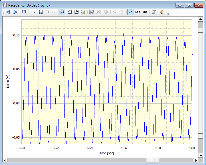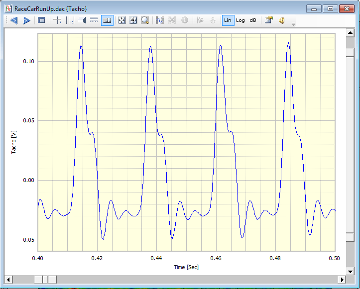 我們的信號每轉產生兩個脈沖。上面的兩個數字都顯示了0.1s的數據,所以很明顯,在圖6中,引擎的旋轉速度明顯快于圖5所示。很明顯,我們的信號不是一個干凈的方波,只要轉速處理算法很復雜而且足夠***,這并不重要。轉速計處理軟件分析整個轉速計信號并產生另一個信號,代表測試時的速度。這可以在圖7中看到。