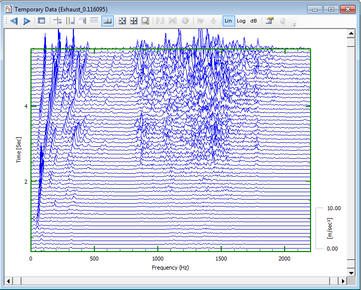 因為我們測試的發動機正在改變速度,所以幾乎不可能從這個頻譜中得出任何有意義的結果。很明顯,我們需要一種不同的方法。我們的***種方法可能是將數據分成幾個部分,并查看從這些部分生成的一系列光譜。這是通過“跳頻FFT”完成的。這需要時間歷史的固定長度部分,執行FFT然后沿著小的增量移動并重復該過程。這產生了一系列在整個測試期間分布的FFT譜,如圖3所示。