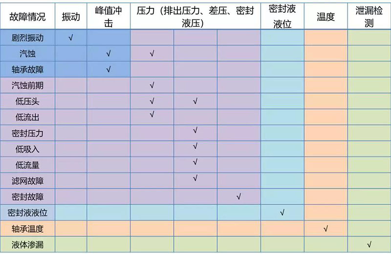 表1匯總了經常發(fā)生的泵故障及如何通過測量獲得故障預警。密封液液位和壓力、泵出口壓力和沖擊壓力峰值等信息組成了預警系統(tǒng)。 振動和溫度測量數據均可指示故障的發(fā)生,并可用于分析根本起因。現代化的泵健康狀態(tài)監(jiān)測方案通過壓力及機械測量數據等關鍵預測維護信息全面掌握泵的情況。